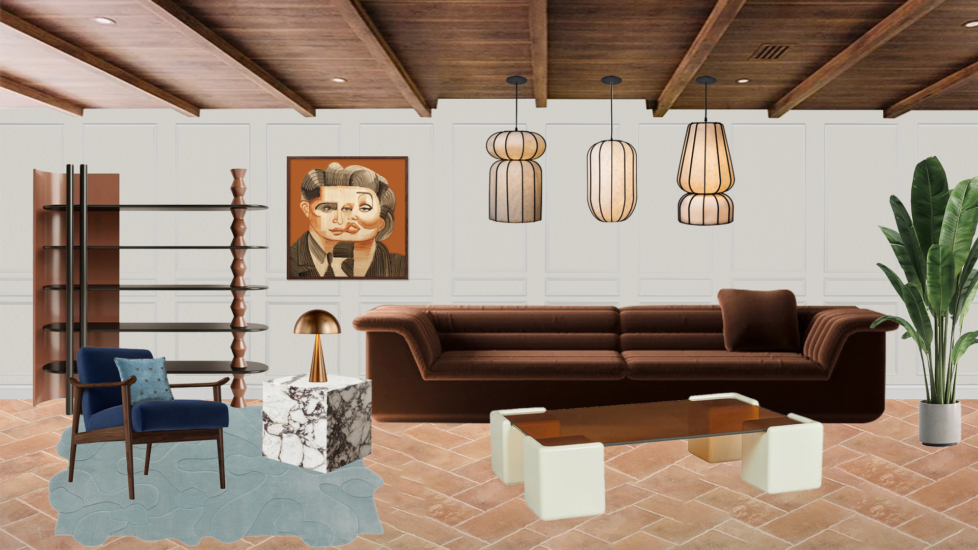 A residential interior inspired by the colors and textures of José Campeche’s 'San Juan Nepomuceno'. The design translates the painting's 18th-century Rococo aesthetic into a modern living space through a color palette of celestial blues, dark brown, and gold.